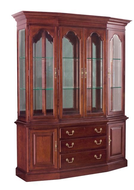 The beautiful canted front china goes well in any setting. From the most formal to casual. Shaped fronts on the base have two doors with one adjustable shelf behind each, three drawers and a silver tray, china deck is outfitted with four doors with six adjustable glass shelves with plate grooves and touch lighting.Read More
