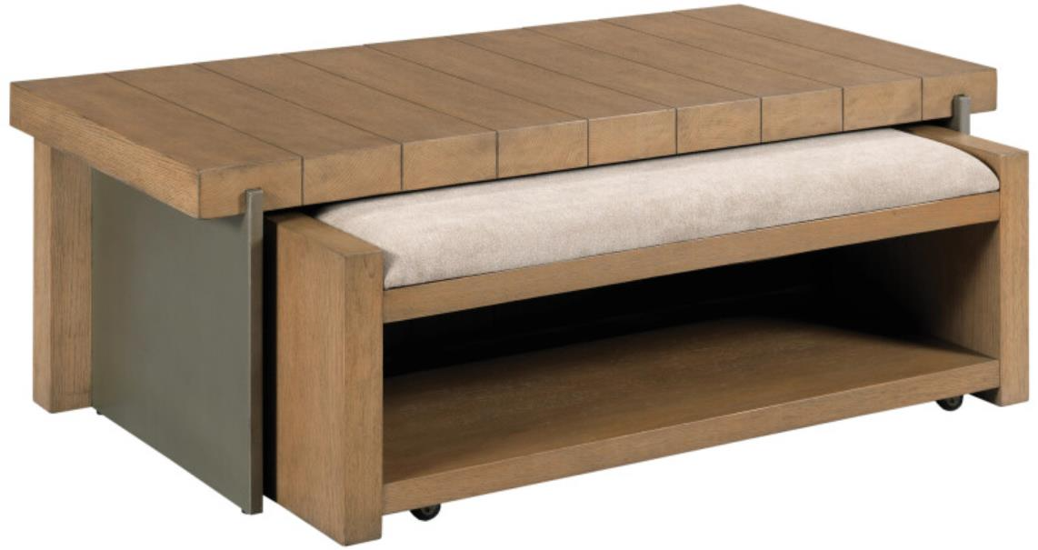 The Hammary Spence Coffee Table and Bench from the Hidden Treasures Collection blends style and function. Crafted from white oak veneers and select solids, it features a rustic plank-style top, a cushioned bench, an open storage shelf, and metal accents. Casters provide mobility, making it perfect for versatile, space-saving living.Read More