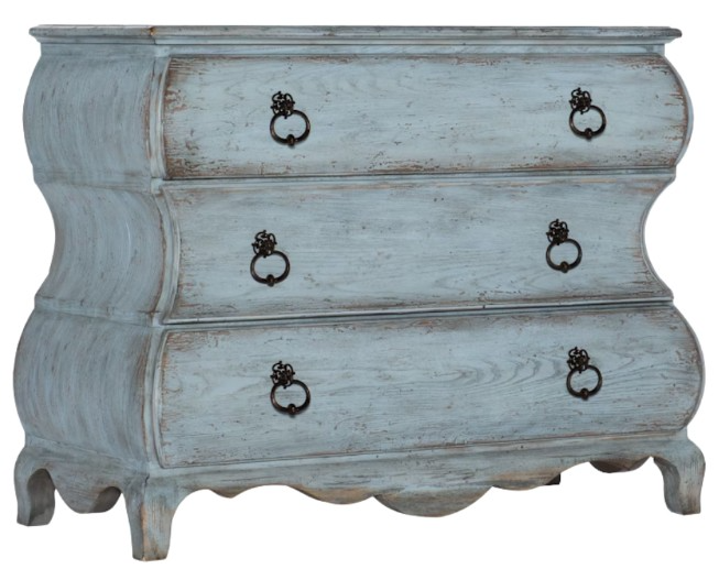 This bombe-shaped bachelors chest in a lovely skylark blue finish with natural wood undertones is a decorator's dream come true. Crafted of poplar and hardwood solids with elm and cedar veneers, the chest has a cord clip on the back panel and a three-plug outlet with USB port, along with a nightlight with touch switch.Read More