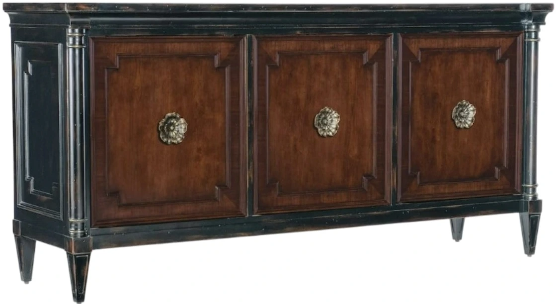 Finish: Exterior: Black Cherry: this finish emulates the vibrancy of the warm cherry finish shining from beneath the Black Cherry patina and includes subtle distressing which exemplifies the heirloom nature of the collection. Handpainted accents on the drop-front. Door fronts: Maraschino Cherry: finished using natural grain Cherry veneers showcasing the dramatic cathedral structure with the selective inclusion of naturally occurring knots to deliver a rich warm cherry finish and a smooth sophisticated aesthetic. Custom floral decorative pulls feature an antique bronze color.