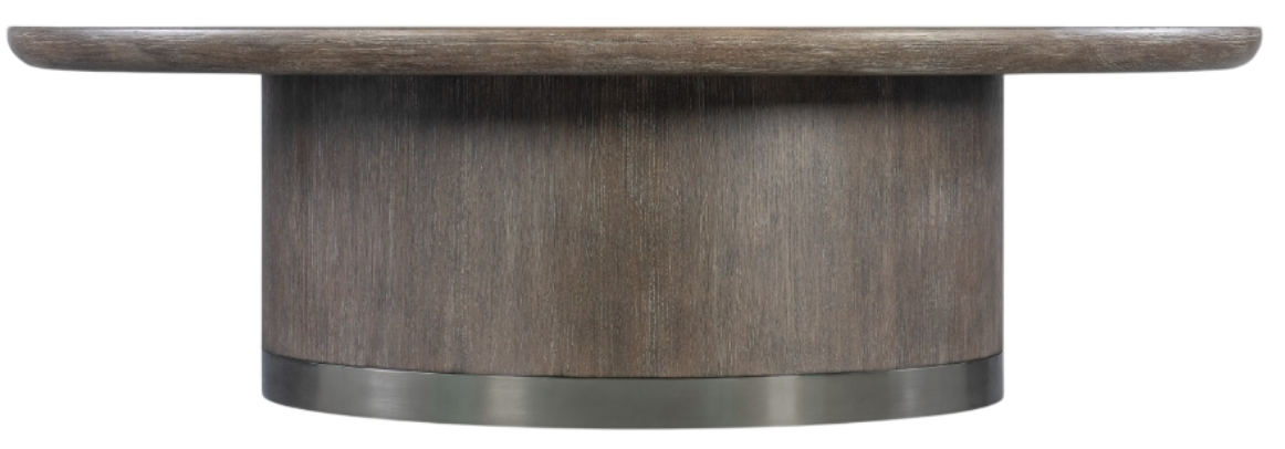 Sleek and stylish with a simple and timeless round profile, the Modern Mood cocktail table combines quartered oak veneers with a metal-wrapped band around the base in a warm pewter finish. Crafted of quartered oak veneers in a dark mink finish, the table has matched veneers on the top and is finished on all sides.Read More