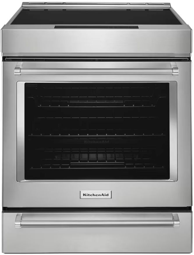 This KitchenAid 6.4 cu. ft. 30-inch 4-Element Induction Slide-In Convection Range combines the precision of induction with the power of Air Fry. Sensor-induction cooktop generates heat directly within cookware, and the oven features Even-Heat True Convection plus air fry mode, with an included dishwasher-safe air fry basket that aids in crisping and browning.Read More