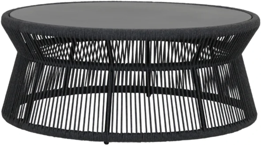 The Milano Coffee table delivers a winning combination of both whimsy and refinement, with striated rope design and hourglass frame. This table features a polished natural Granite marble top, and round aluminum base wrapped in premium olefin rope in slate.Read More