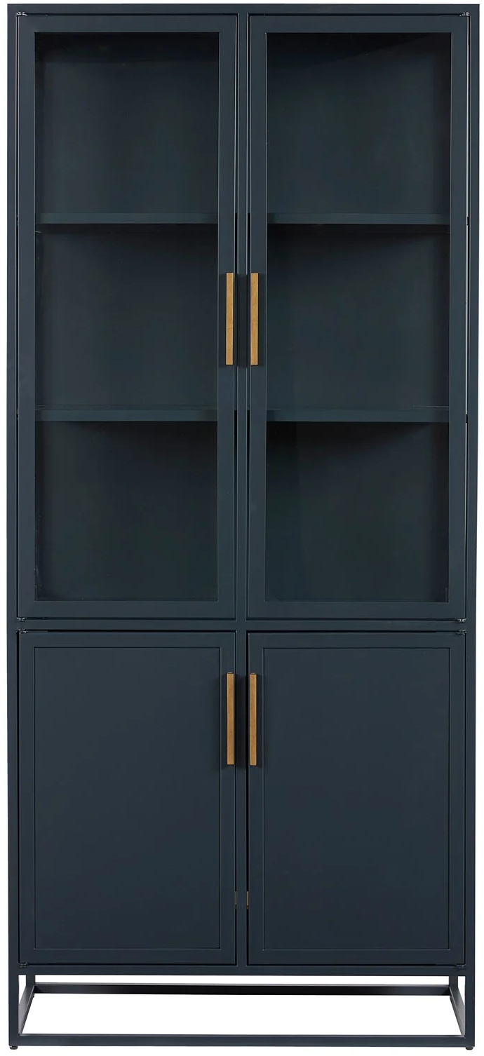 Add vertical storage to living areas with the Santorini Tall Metal Kitchen Cabinet, a serenely confident piece in a deep blue finish with clear glass doors and sleek gold bar hardware.Read More